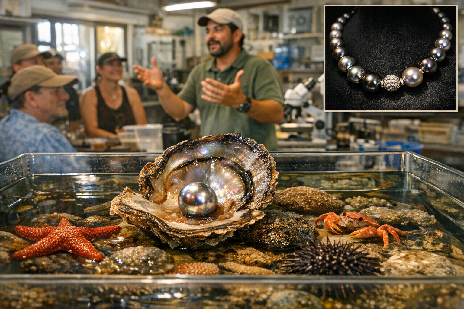 El laboratorio. Interacción directa con organismos marinos vivos — ostras perlíferas, cangrejos, erizos, estrellas de mar, peces. Ves el proceso de implantación del núcleo que inicia el cultivo de la perla. Ves las distintas etapas del proceso y entiendes por qué tarda años.