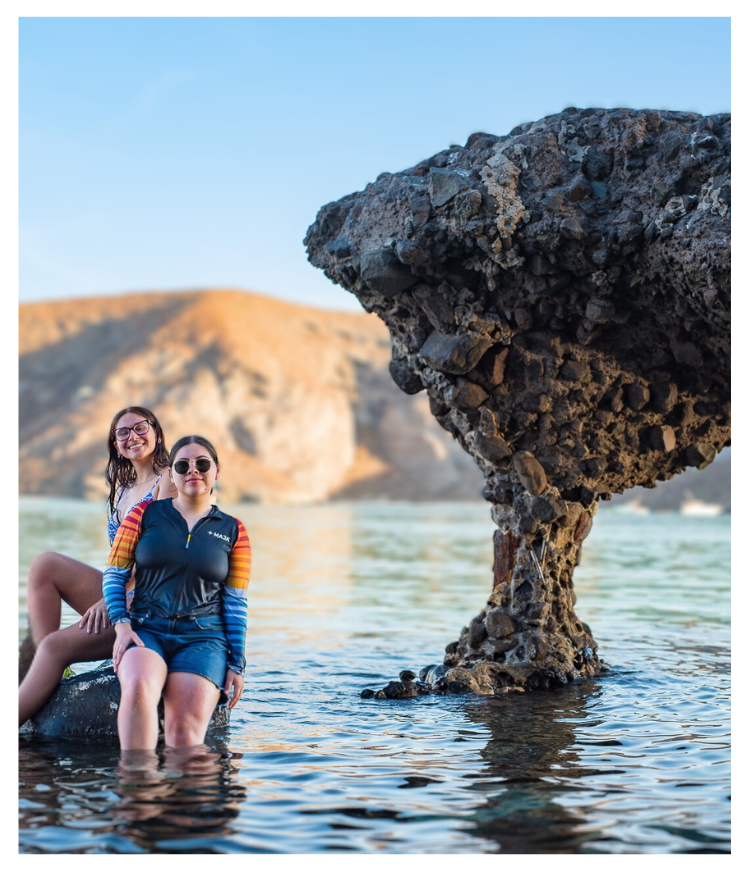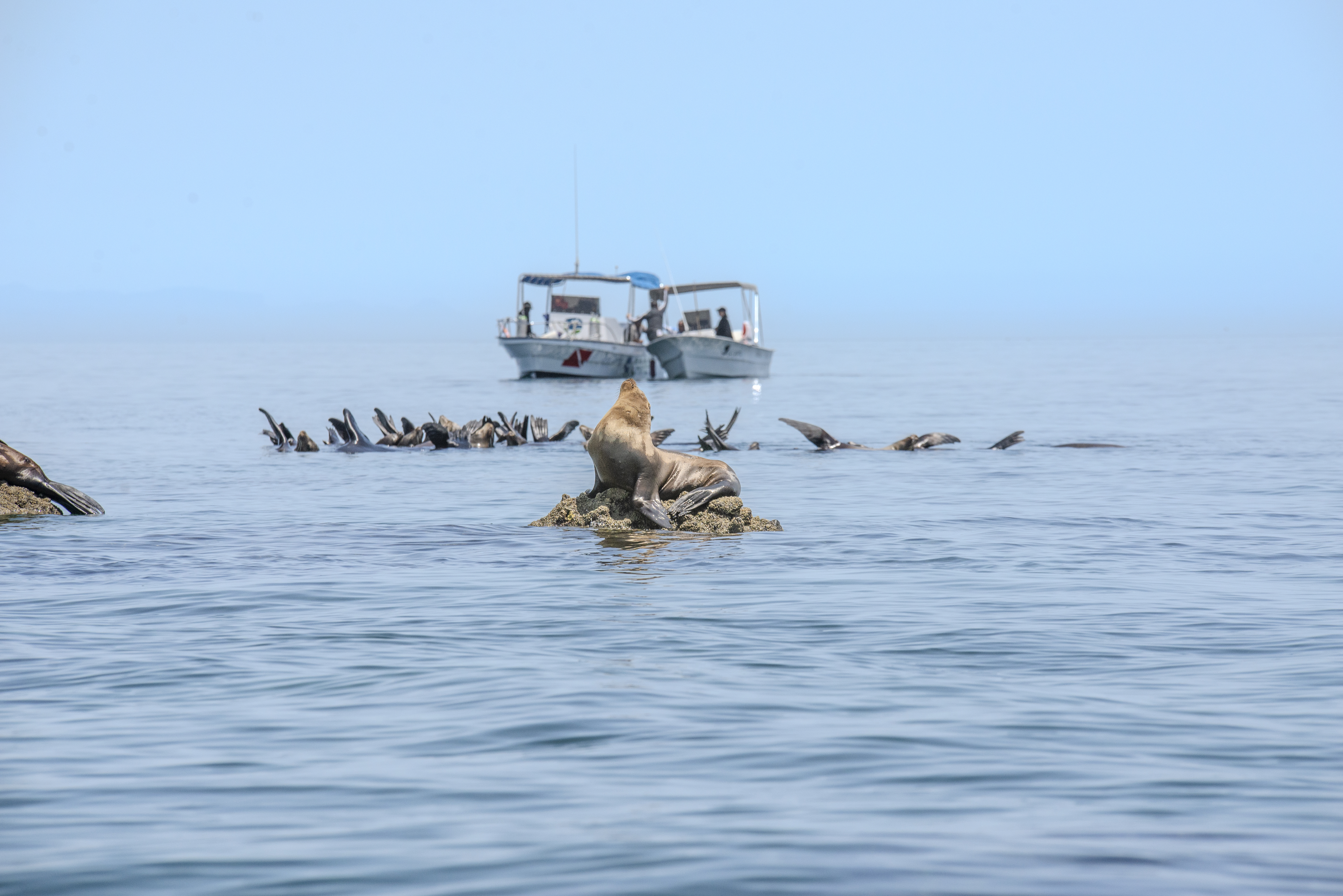 La primera parada es San Rafaelito. Lobos marinos juguetones nadan alrededor. Te pones el snorkel y te unes a ellos. Sus cuerpos ágiles se mueven rápido, invitándote a su mundo. Este encuentro está disponible solo de septiembre a mayo, cuando los lobos marinos están presentes y el agua es clara.
